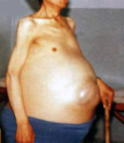 患者術(shù)前腹水原樣,走動(dòng)只能靠拐杖。