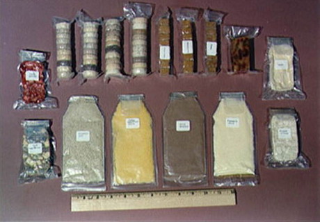 美國宇航員的一份太空食品。照片中包括:蘑菇湯,橙柚汁,可可飲料,菠蘿汁,雞肉與肉汁,梨,草莓,牛肉和蔬菜。