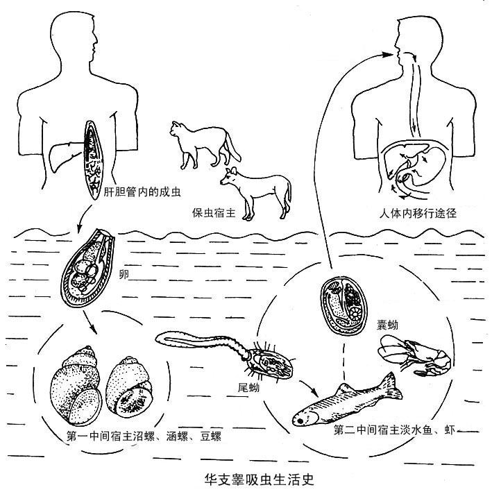 “蟲卵下水后,被第一中間宿主淡水螺吞食,在螺的消化道中孵出毛蚴。毛蚴穿過螺腸壁,在消化道周圍的淋巴間隙中進(jìn)行無性繁殖,經(jīng)過一代胞蚴和一代雷蚴的增殖發(fā)育,最后成為許多尾蚴。就是說一個蟲卵,經(jīng)過增殖發(fā)育,就會變成很多個尾蚴。真有點(diǎn)像孫悟空,一個變幾十個。成熟的尾蚴從螺體逸出,在水中游動,遇到適合的第二中間宿主——淡水魚或蝦,特別是‘打邊爐’所需要的鯇魚、沼蝦,即附于體表,隨即鉆入體內(nèi),蛻去尾部,發(fā)育成囊蚴。人或哺乳動物吃了含有囊蚴的生魚、蝦后。囊蚴在胃內(nèi)經(jīng)胃酸和胃蛋白酶的作用,當(dāng)?shù)竭_(dá)十二指腸后,囊壁就會被消化,幼蟲逸出,經(jīng)膽道進(jìn)入肝內(nèi)小膽管,一個月時間就會發(fā)育為成蟲,又可以排卵啦……”