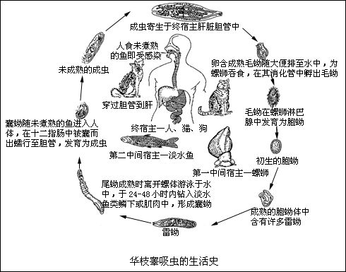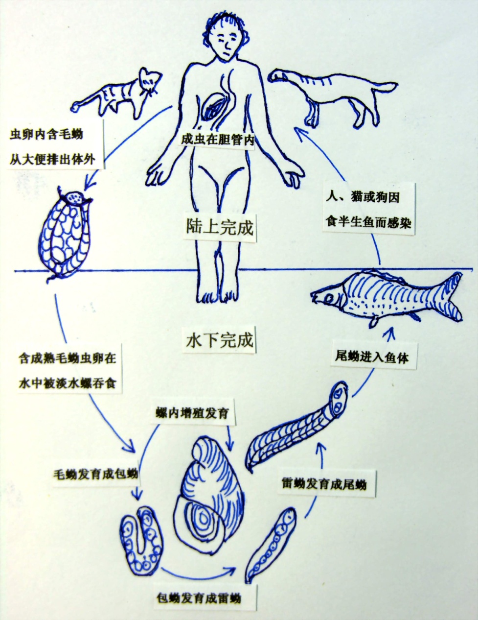 于是,我站起來。好像在給大家講故事地說:“講起生活史,人人都有,何止企鵝生活史呢。寄生蟲也不例外,不過我現(xiàn)在只是拿肝吸蟲講罷了。肝吸蟲是復(fù)殖類吸蟲,生活史比較復(fù)雜,它需要一個終宿主和兩個中間宿主。大家已經(jīng)知道成蟲是寄生在人、貓、狗、豬、鹿、貂等哺乳動物肝臟的小膽管或膽囊內(nèi),它以吸養(yǎng)膽汁的蛋白質(zhì)為生。雌雄同體,成熟的蟲體就開始排卵,卵從小膽管流進(jìn)膽囊,經(jīng)膽囊進(jìn)入總膽管到十二指腸,再經(jīng)下消化道的小腸、大腸、直腸,混進(jìn)糞便中排出體外。當(dāng)這些含有蟲卵的糞便,拿去喂魚、肥塘,就給蟲卵下水繁殖的機(jī)會。正如我?guī)Т蠹胰ァ河巍瘯r看到淡水魚塘里建有無數(shù)的公廁,就是給肝吸蟲繁殖一個難得的機(jī)會。