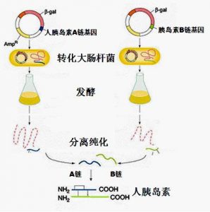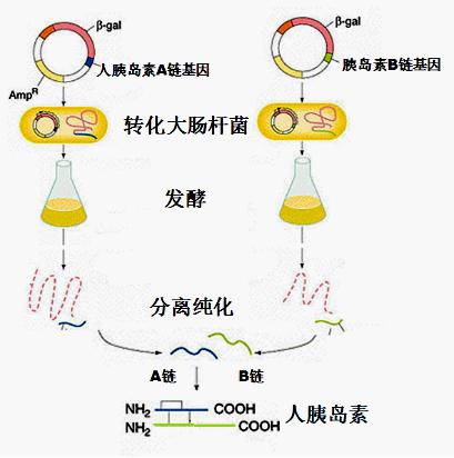 根據(jù)這樣的設(shè)想,進行了大量的研究,建立了胰島素的AB鏈合成法。將人工合成的人胰島素A鏈和B鏈基因分別與半乳糖苷酶基因連接,形成融和基因,再分別轉(zhuǎn)入大腸桿菌中構(gòu)建能夠分別表達A鏈和B鏈基因與半乳糖苷酶基因工程菌。