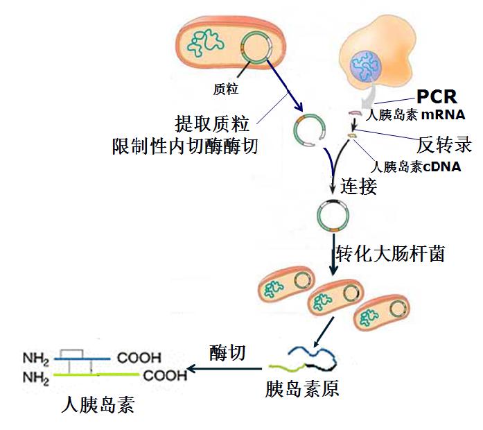 最初,人們了解這些以后設(shè)想將胰島素基因如果轉(zhuǎn)到細菌,比如大腸桿菌中來生產(chǎn)人胰島素。但是由于大腸桿菌不具備胰島 細胞的加工、轉(zhuǎn)運能力;而且大腸桿菌對基因的偏好性與人的細胞對基因的偏好性不同,將人的胰島素基因轉(zhuǎn)移到大腸桿菌中,基因轉(zhuǎn)錄和翻譯效率就會大大降低。另外,由于人們掌握了人胰島素的氨基酸組成和基因轉(zhuǎn)譯成蛋白質(zhì)的“三聯(lián)密碼子”原則后,科學(xué)家們就考慮可以根據(jù)人胰島素的氨基酸排列順序,和大腸桿菌對基因的脫氧核糖核酸偏好性,分別人工合成胰島素A和B鏈的基因,轉(zhuǎn)入大腸桿菌,分別表達,然后分離純化后在經(jīng)過化學(xué)加工,合成人胰島素。