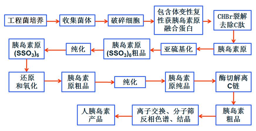 這樣的生產(chǎn)工藝過程和條件過于復(fù)雜,由于A鏈和B上共存在六個半胱氨酸殘基,體外二硫鍵的正確配對率較低,通常只有10%-20%,因此采用這條工藝路線生產(chǎn)的重組人胰島素每克成本高達100美元以上。為了進一步降低生產(chǎn)成本,隨后又開發(fā)了新的利用基因工程菌生產(chǎn)重組人胰島素的工藝路線。