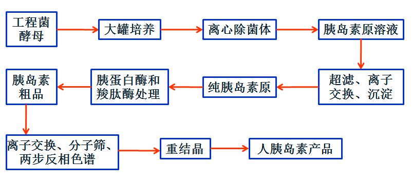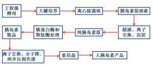 首先酵母菌表達的是能夠分泌到細胞外的可溶性胰島素原,而不是沒有活性的不可溶的包含體。因此工程菌大規(guī)模培養(yǎng)后,胰島素原溶解在培養(yǎng)液中,只需離心除去菌體,不需要破碎細胞,更不需要變性復(fù)性。經(jīng)過比較簡單的超濾濃縮,除去部分小分子雜質(zhì),然后進行離子交換色譜,直接將胰島素原分離純化。然后加入沉淀剤使之沉淀,離心獲得純化的胰島素原。利用胰蛋白酶和羧肽酶處理,脫去C肽,經(jīng)過進一步的純化、結(jié)晶,即可獲得合格的人胰島素產(chǎn)品。