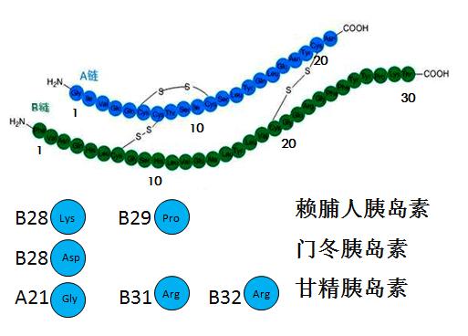 超短效胰島素,起效時間為15分鐘,作用高峰30~45分鐘,持續(xù)時間約2~4小時,主要有天門冬氨酸胰島素和賴脯胰島素。這兩個都是人胰島素類似物,是通過將人胰島素的肽鏈上的氨基酸進行移位、替代、重組等進行新的排列,來改變胰島素作用時間。賴輔胰島素是在人胰島素B28位脯氨酸由帶負電荷的賴氨酸取代而形成;而門冬胰島素則是由人胰島素B28位脯氨酸由天門冬氨酸代替形成。之所以它們能在短時間內(nèi)迅速發(fā)揮降糖作用就是因為這些結(jié)構(gòu)的改變使電荷排斥,阻隔了胰島素單體間的自我聚合。在溶液中胰島素主要以單體和雙體的混合物形式存在,而單體就是胰島素作用的結(jié)構(gòu),所以其作用時間就快了。