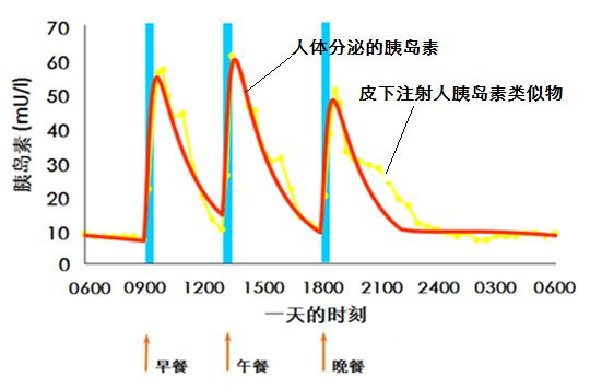 人體分泌的胰島素是“快進快出”,進餐后血糖開始升高,胰腺受到刺激立刻大量分泌胰島素進入血液,很快達到峰值。然后分泌又迅速減少,恢復(fù)到基礎(chǔ)胰島素水平。餐后因消化產(chǎn)生的大量葡萄糖進入肝臟,在胰島素的控制下迅速轉(zhuǎn)化為糖原,儲存起來,使得血液中的葡萄糖濃度很快降到正常水平。