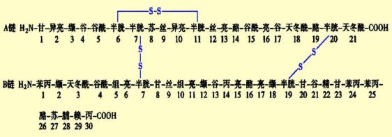 桑格的研究證明牛胰島素由A、B兩個肽鏈組成,A鏈有21個氨基酸11種,B鏈有30個氨基酸15種,共26種51個氨基酸組成。其中A鏈第7位的半胱氨酸與B鏈第7位的半胱氨酸、A鏈第20位的半胱氨酸與B鏈的第19位半胱氨酸的巰基形成兩個二硫鍵,使A、B兩鏈連接起來;此外A鏈中第6位半胱氨酸與A鏈第11位半胱氨酸的巰基之間也存在一個二硫鍵。