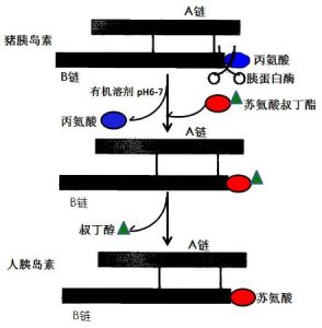 后來,人們發(fā)現(xiàn)在pH為6-7的有機(jī)相中使用胰蛋白酶催化,在過量的蘇氨酸叔丁酯的存在下,可以將豬胰島素B鏈C末端的丙氨酸替換下來,形成的人胰島素叔丁酯再用三氯乙酸脫去叔丁酯基團(tuán),最終獲得人胰島素,該過程的總轉(zhuǎn)化率為60%。這種方法使得豬胰島素改造成為人胰島素更加簡便,生產(chǎn)成本更加低廉,使得豬胰島素改造成人胰島素在臨床上治療糖尿病成為現(xiàn)實。