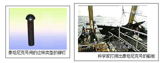 美國(guó)國(guó)家技術(shù)監(jiān)督局的幾位科學(xué)家利用顯微鏡和圖像分析儀,對(duì)泰坦尼克號(hào)殘骸進(jìn)行研究時(shí)發(fā)現(xiàn),制造鉚釘使用的鋼鐵質(zhì)地極其不純,其中的礦渣含量竟然超過了標(biāo)準(zhǔn)鋼材的2倍。根據(jù)冶金學(xué)理論,這種過量的不純物質(zhì)使得鉚釘在劇烈的撞擊過程中很容易發(fā)生斷裂。