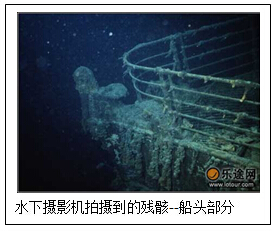 終于在上個(gè)世紀(jì)八十年代,美法科學(xué)家乘坐法國(guó)科學(xué)考察船“天底號(hào)”,到達(dá)沉船海面,科學(xué)家乘坐深海探險(xiǎn)潛艇“鸚鵡螺號(hào)”??梢詽撊牒O挛迩е亮椎纳詈_M(jìn)行探索和調(diào)查工作。艇上帶有手提箱大小叫做“羅賓漢”的水下機(jī)器人,它有攝像機(jī)和機(jī)械手,它可以進(jìn)入船體內(nèi)部進(jìn)行攝像和搜索。