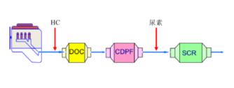 柴油車尾氣的特征是低溫,氧過量,HC和CO還原劑偏少,NOx和PM高,單種技術(shù)不能解決問題。采用選擇性催化還原(SCR)催化劑凈化NOx,采用氧化催化劑(DOC)凈化HC、CO和PM中的有機(jī)液體組分(SOF),采用帶催化劑涂層的顆粒物捕集器凈化PM中的干碳(Soot)部分。柴油車尾氣凈化的成本遠(yuǎn)高于汽油車。柴油車的SCR,DOC和CDPF配置如圖3所示。