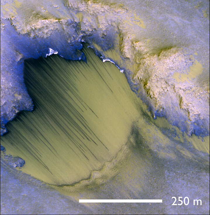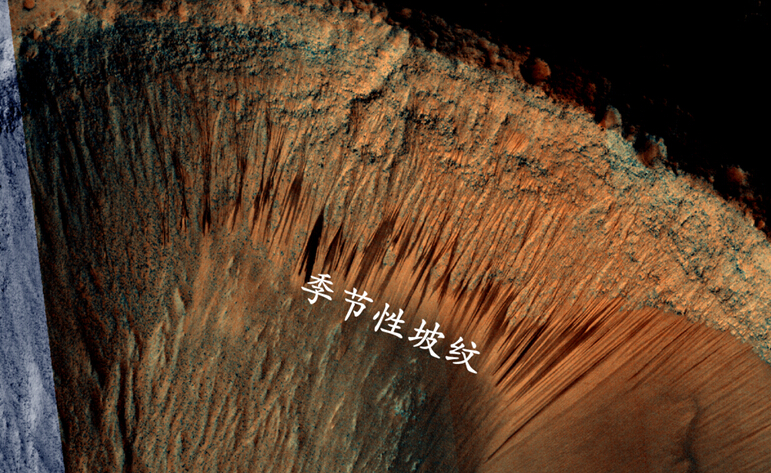圖3 火星上Melas Chasma地區(qū)扇形細(xì)顆粒物質(zhì)上發(fā)育的季節(jié)性坡紋(NASA / JPL-Caltech / University of Arizona),彩色影像源自MRO上的HiRISE高分辨相機(jī)。