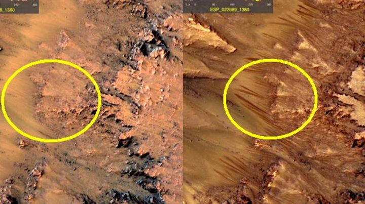 圖4 拍攝于不同時間的同一地區(qū)影像,顯示季節(jié)性坡紋有時出現(xiàn),有時消失據(jù)推測