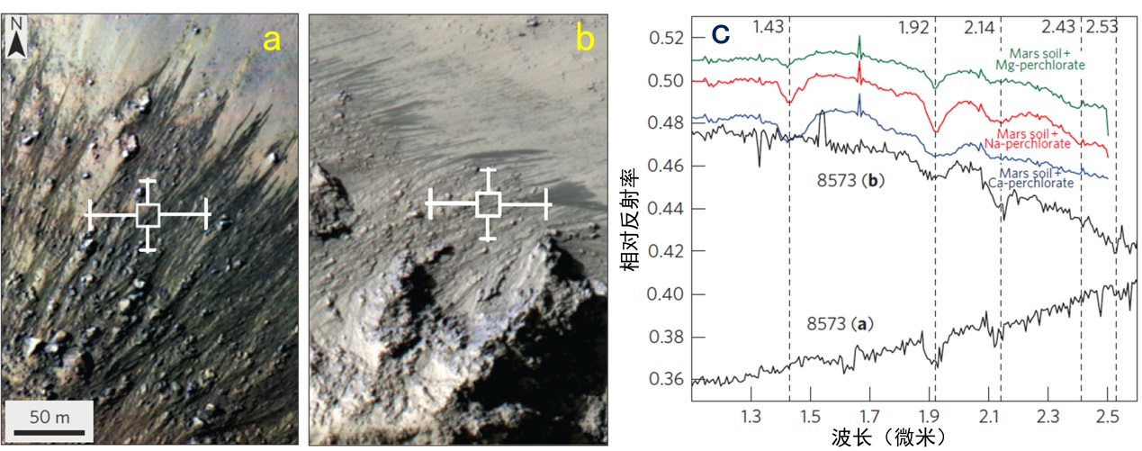 上圖中,a為源自Horowitz撞擊坑中央峰基巖的季節(jié)性坡紋(HiRISE影像,攝于第28個火星年),b為同一HiRISE影像中另一中央峰上的季節(jié)性坡紋(比例尺同a)。c圖中的兩條黑色譜線分別為CRISM測得的圖a和圖b中方框區(qū)域的光譜,彩色譜線為火星土壤光譜與各種鹽類光譜混合的結(jié)果,從上到下依次為火星土壤與高氯酸鎂、高氯酸鈉、高氯酸鈣的混合光譜。