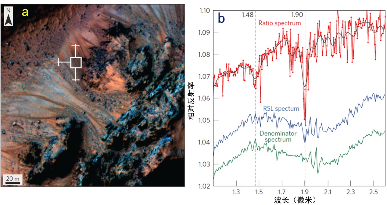 a為Hale撞擊坑中央峰的季節(jié)性坡紋,上北下南,太陽光從左側(cè)照入,影像源于HiRISE相機(jī),攝于第31個火星年。b為a圖中方框區(qū)域的紅外光譜。
