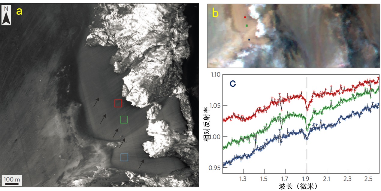 上圖中,a和b中的彩色方框為光譜測量的區(qū)域;c為光譜測量結(jié)果,不同顏色的譜線分別對應(yīng)于a和b圖中不同的測量區(qū)域。d為地面實驗室內(nèi)測得的各種含水鹽類化合物的譜線。