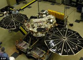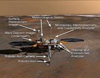 2007年8月4日發(fā)射的“鳳凰”號火星著陸器就是一項典型的小型任務(wù),耗資4.2億美元,設(shè)計壽命90天?!傍P凰”號的主要科學(xué)目標(biāo)是挖掘火星表面冰層,并用相關(guān)有效載荷驗證火星上是否存在適合微生物生存的環(huán)境。此外,“鳳凰”號將試驗和驗證采用反推火箭克服重力,實現(xiàn)火星表面軟著陸的技術(shù)(圖1),這一技術(shù)途徑不同于機遇號和勇氣號火星車“降落傘+氣囊”的緩沖著陸方式。