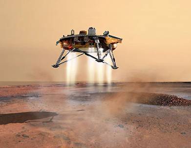 圖1 “鳳凰”號采用反推火箭克服重力,實現(xiàn)火星表面軟著陸