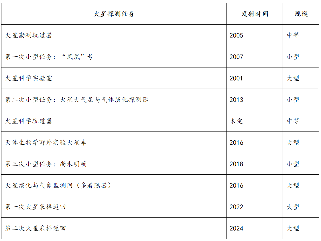 表1 美國2005年后的火星探測任務(wù)及其規(guī)模