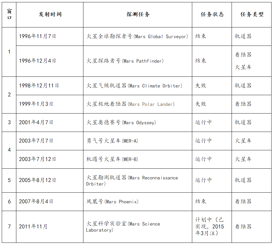 圖3 1996~2011年期間每個火星窗口發(fā)射的火星探測器