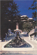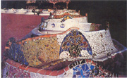 公園入口處有高迪設(shè)計的門衛(wèi)和辦公用的兩座小樓。進園之后,一條造型別致的有分有合的大臺階把人引向一個多柱大廳,大廳后面接著古希臘式的劇場。大臺階又繼續(xù)把人引上多柱大廳上的屋頂平臺。平臺廣闊,寬深各約三十多米,周圍有矮墻和坐椅,是游人游憩、聚會、散步和跳舞的好去處。