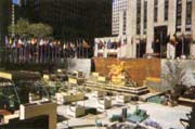 建筑群的中心是一個(gè)下凹的小廣場(chǎng),廣場(chǎng)正面有一座金光閃閃的飛翔著的雕像,下面有噴泉水池,浮光耀眼,冬季可作溜冰場(chǎng)。小廣場(chǎng)南面是帶狀街心花園,供人們小憩。在市中心巨廈之間布置這樣的環(huán)境,既鬧中有靜,又富有空間構(gòu)圖的變化。