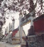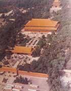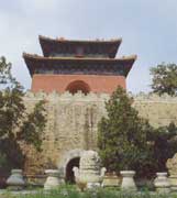 明代遷都北京后,在昌平天壽山形成集中陵區(qū),稱“十三陵”,其制度基本遵循孝陵形制。十三陵距北京約45公里,陵區(qū)的北、東、西三面山巒環(huán)抱,十三陵沿山麓散布,各據(jù)崗巒,面向中心——長陵。長陵(明成祖)據(jù)天壽山主峰前,其南6公里處,有崛起對峙的小山兩座,成為整個陵區(qū)的入口。環(huán)抱的地形造成內(nèi)斂的完整環(huán)境;整個陵區(qū),南北約9公里,東西約6公里,結(jié)合自然地形,各陵彼此呼應(yīng),成為氣象宏廓而肅穆的整體。
