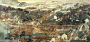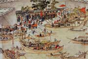 唐時(shí),由于城內(nèi)河道密布,橋也特別多,在白居易和劉禹錫作蘇州刺史時(shí),蘇州橋數(shù)在390座和370座之間。城門則有水陸各8座,每面各有2座,至今城西南角盤門尚留水、陸城門遺址。白居易詩:“遠(yuǎn)近高低寺間出,東西南北橋相望。水道脈分棹鱗次,里閭棋布城冊方。”“處處樓前飄吹管,家家門外泊舟舫! 描述了唐時(shí)這座水鄉(xiāng)城市的風(fēng)貌。南宋時(shí)蘇州稱平江,是經(jīng)濟(jì)上和軍事上都很重要的城市。