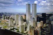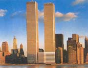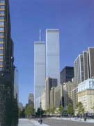 原址位于美國紐約曼哈頓島西南端,西臨哈德遜河,由美籍日裔建筑師雅瑪薩基(山崎實)設計,建于1962-1976年。占地6.5公頃,由兩座110層(另有6層地下室)高411.5米的塔式摩天樓和4幢辦公樓及一座旅館組成。摩天樓平面為正方形,邊長63米,每幢摩天樓面積46.6萬平方米。在2001年9月11日的恐怖襲擊中坍塌。