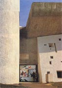 這個(gè)教堂的設(shè)計(jì)中,勒.柯布西耶把重點(diǎn)放在建筑造型上和建筑形體給人的感受上。他摒棄了傳統(tǒng)教堂的模式和現(xiàn)代建筑的一般手法,把它當(dāng)作一件混凝土雕塑作品加以塑造。教堂造型奇異,平面不規(guī)則;墻體幾乎全是彎曲的,有的還傾斜;塔樓式的祁禱室的外形象座糧倉;沉重的屋頂向上翻卷著,它與墻體之間留有一條40厘米高的帶形空隙;粗糙的白色墻面上開著大大小小的方形或矩形的窗洞,上面嵌著彩色玻璃;入口在卷曲墻面與塔樓的交接的夾縫處;室內(nèi)主要空間也不規(guī)則,墻面呈弧線形,光線透過屋頂與墻面之間的縫隙和鑲著彩色玻璃的大大小小的窗洞投射下來,使室內(nèi)產(chǎn)生了一種特殊的氣氛。