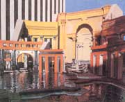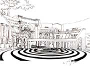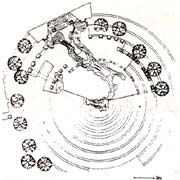 新奧爾良是美國南方城市。1973年,市政當(dāng)局決定在該市意商居民集中的地區(qū)建造意大利廣場(chǎng)。意大利廣場(chǎng)中心部分開敞,一側(cè)有祭臺(tái),祭臺(tái)兩側(cè)有數(shù)條弧形的由柱子與檐部組成的單片“柱廊”,前后錯(cuò)落,高低不等。這些“柱廊”上的柱子分別采用不同的羅馬柱式,祭臺(tái)帶有拱券,下部臺(tái)階呈不規(guī)則形,前面有一片淺水池,池中是石塊組成的意大利地圖模型,長(zhǎng)約24米。新奧爾良市的意裔居民多源自西西里島,整個(gè)廣場(chǎng)就以地圖模型中的西西里島為中心。廣場(chǎng)鋪地材料組成一圈圈的同心圓,即以西西里島為中心。廣場(chǎng)有兩條通路與大街連接,一個(gè)進(jìn)口處有拱門,另一處為涼亭,都與古代羅馬建筑相似。廣場(chǎng)場(chǎng)上的這些建筑形象明確無誤地表明它是意大利建筑文化的延續(xù)。