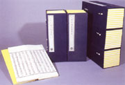 線裝書為閱讀方便,一般不宜太厚,因此,一般較厚的書往往要分卷訂為多冊。把一部書的多冊包裝在一起,往往采用函套、書盒或夾板幾種形式。函套是最常用的一種形式,它由厚紙板再裱上紡織品,將一部書包裝在一起,并露出書的上下切口。書盒多為木板制成,將一部書裝在盒內(nèi)保存。夾板包裝法則是上下為與書籍尺寸相同的木板,用絲帶聯(lián)連,將一部書夾在中間。