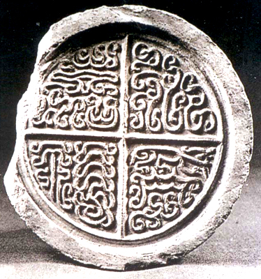 陜西咸陽出土。戰(zhàn)國。泥質(zhì)灰色。圓形,邊輪較寬,中心飾漩渦紋,周有細(xì)波紋,四區(qū)分布流云。紋飾雕刻而成,其中云朵線條纖細(xì),層次豐富,立體感強(qiáng)。為模制瓦當(dāng)工具。