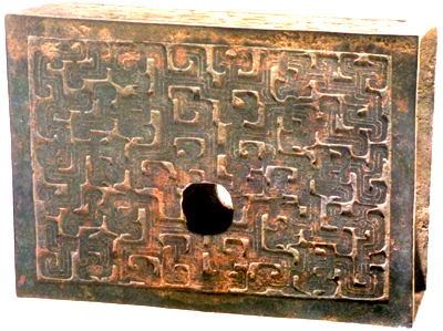 陜西鳳翔姚家崗出土。春秋中期。飾件呈長方形,面飾蟠螭紋。較寬兩面有相對穿孔。