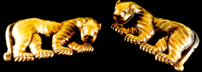 陜西神木納林高兔出土。戰(zhàn)國(guó)。雌雄虎各一。雌虎,頭寬而圓,暴眼圓睛,扇形小耳豎貼腦際。四肢肥大,前后交叉,側(cè)臥,低頭轉(zhuǎn)向右方,作吮吸狀。尾下垂,端上卷,爪趾發(fā)達(dá),排列整齊。頸部、右后腿下部和尾上部均有小孔。雄虎與雌虎造型略有不同,通體飾凸線(xiàn)斜紋,耳稍大,頭向左移,姿態(tài)雄偉。
