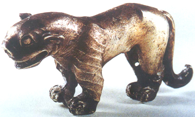 陜西神木納林高兔出土。戰(zhàn)國。方鼻圓頭,環(huán)眼,兩耳外撇,張口暴齒,臀部聳起,立前視,呈現(xiàn)出一種咆哮的神態(tài),頸短粗,軀體渾圓而中空,四肢粗壯,下趾發(fā)達,長尾垂地上卷。雙肩及前肢隱起的斜條紋和尾鼻的凹弦紋裝飾,突出表現(xiàn)形體的結構,增加了質感的效果。