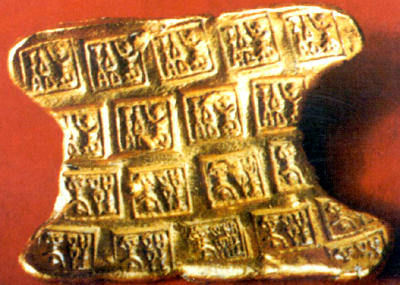 安徽六安出土。戰(zhàn)國(guó)。金質(zhì)版狀。束腰形,兩端翹,腰間鼓,割成弧形。正面作排列式壓印,篆書(shū)“郢爰”兩字。郢為楚國(guó)都通稱(chēng),爰為重量單位。支付使用時(shí),大多切割成小方塊,稱(chēng)其重量,作等價(jià)物交換。