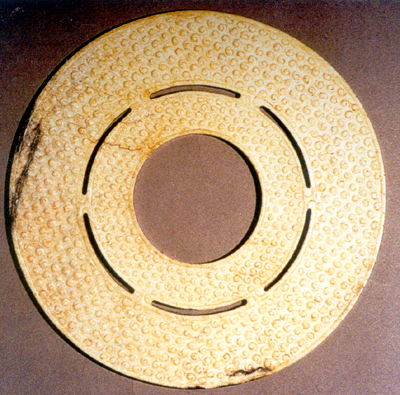 戰(zhàn)國。玉料呈白色。個體較大,厚薄均勻,重環(huán),其間有六處相互聯(lián)結(jié)。兩面皆為谷紋,排列有序。外環(huán)邊緣上有六個分布均勻的小孔,用以穿系懸佩。