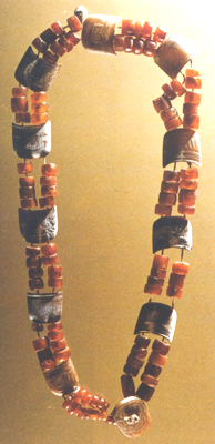 河南三門峽上村嶺出土。春秋。由一百零一枚雞血石珠,十枚馬蹄形石片、一枚橢圓形玉片和兩枚小石飾組成。雞血色石珠用雙線串成二行,每隔若干枚(最多者十四枚分作兩行并列,最少者六枚分作兩行并列,其它界于二者數(shù)量之間,但多少不等,亦分兩行串連)珠子,雙線并穿入一枚馬蹄形玉片中。橢圓形玉片垂于整組項(xiàng)飾的下方。上述雞血色石珠的形狀和大小皆不一致。馬蹄形玉片皆以璞玉制成,正面雕琢雙陰線勾連紋。背面平齊,兩端壁上各鉆一孔,與底面孔相通,用于貫線串連。橢圓形玉片上刻雙陰線周邊和勾云紋。此項(xiàng)飾出土于墓主人的頸項(xiàng)間,系墓主人生前享用的項(xiàng)鏈,因受到死者的珍愛,死后用于陪葬,它紅白相間,色彩絢麗,出土?xí)r排列有序,既有歷史價(jià)值,又具珍貴的藝術(shù)性。