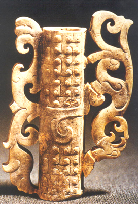 安徽長豐楊公出土。戰(zhàn)國晚期。玉料呈黃色,質(zhì)地細(xì)潤,表面有光澤。主體呈圓筒狀,中空,外壁中段雕琢有突起的寬弦紋和勾云紋,其上下的管壁雕陰線勾連臥蠶紋。管的一側(cè)雕鏤鳳鳥一。若將此器倒置,可見這只鳳鳥為立姿。鳳首高冠與器壁相連接,鳳鳥圓眼張喙、曲頸,頭向右下回旋。鳳身卷曲,足爪與器壁連接。長尾修翎,向右上方旋轉(zhuǎn)。管壁另一側(cè)雕鏤卷草式鳳尾,呈多曲狀附于器身。此器多鏤空,造型生動(dòng)、美觀,惜頂端一側(cè)稍殘。
