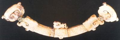 河南輝縣出土。戰(zhàn)國。青白色。體扁平,由七塊玉組合而成,中間一塊近方形,雕變形云紋,其上透雕一獸,作回首垂尾卷伏狀,下端有一鼻鈕,兩側(cè)的玉塊較長,飾變形云紋,再外側(cè)玉塊雕成龍頭形。此五塊玉均有穿孔,由一銅片貫連。銅片的兩端各出一小鎏金銅獸首,首銜透雕云頭飾。結(jié)構(gòu)新穎,制作精致。