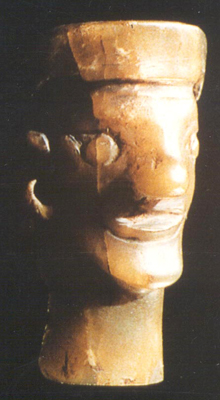 河南光山黃君孟墓出土。春秋。黃褐色。圓雕。人首作橢圓形,成正視圖像。頭戴兩端下垂的軟帽,臣字形眼,高鼻梁,口微張,雙耳佩環(huán)。筒形長頸。頭頂至頸的中心有一直孔,可穿系佩飾。