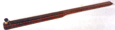 湖北隨縣擂鼓墩出土。戰(zhàn)國早期。弦樂器,木質(zhì)。形若棒狀,一半近圓。琴面平直,狹長,首端立一蘑菇狀拴弦柱,柱旁和琴尾相對各亙一嶽山,兩嶽外側(cè)均平列五個弦孔。琴身首起52厘米為狹長形音箱,周壁平直,底板首端開一橢圓形孔與內(nèi)通。琴身另一段底部弧圓,尾端呈坡狀上收。通體以黑漆為地,底、側(cè)板均以朱、黃兩色繪菱形紋、繩紋、鱗紋、鳳鳥紋、變形云紋、三角雷紋、盤龍和人形紋,尤以跨乘雙龍的人形紋格外奇異。形制獨特,彩繪絢麗。