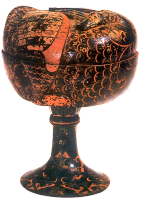 湖北江陵雨臺(tái)山出土。戰(zhàn)國(guó)中晚期。此豆為木胎,深盤(pán),短柄、喇叭座。蓋與盤(pán)合成一只卷伏的鴨子。器表髹黑漆,用朱紅、金黃等色漆彩繪。器內(nèi)髹朱漆。鴨尾兩側(cè)繪兩只對(duì)稱(chēng)的金鳳,作回首站立狀。柄部和座部繪三角云紋和卷云紋。