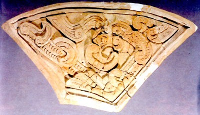鐘舞部模。其各邊長度,內(nèi)側(cè)12、外側(cè)36.5、左右側(cè)分別為18.5和22厘米,厚4-5厘米。紋飾為浮雕式,鳳眼凸出,冠高似飄起,篆下鉤,身卷曲呈C形,轉(zhuǎn)角處有一翅,填鱗片紋。造型渾樸,富于特色。