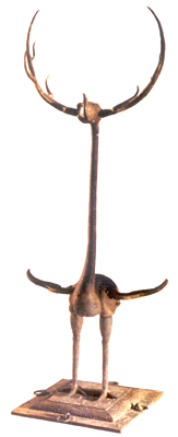 湖北隨縣擂鼓墩出土。戰(zhàn)國早期。作鶴形佇立,展翅揚喙,頭側(cè)有雙鹿角。角及首、頸上有錯金云紋。下有方形承座,座面飾細(xì)密的蟠螭紋,四邊有穿索用環(huán)。