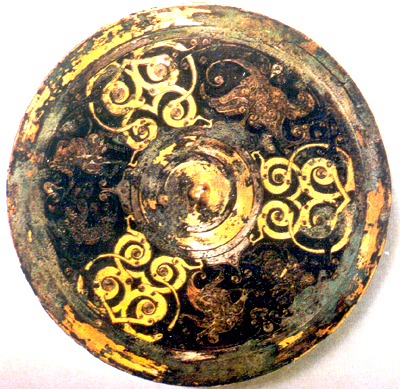 河南洛陽金村出土。戰(zhàn)國中晚期。鏡背錯金銀。鈕座圓形,周圍有三處云紋,間以騎士斗獸圖案。鏡面用含鍚量高的白色青銅制成,與鏡背成分不同,是珍貴的復合鏡,花紋也極細膩美觀。