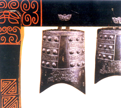 河南信陽(yáng)長(zhǎng)臺(tái)關(guān)出土。戰(zhàn)國(guó)中晚期。鈕鐘十三件成組,飾蟠虺紋,以有獸面的穿釘懸于架上。出土?xí)r附有木槌。同出遣冊(cè)記“鐘以大十有三”。最大一鐘紋飾與其它略異,銘云“惟荊歷屈欒,晉人救戎于楚境”。“屈欒”即屈夕,楚月名,相當(dāng)秦十一月。