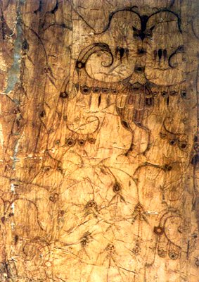 湖北江陵馬山楚墓出土。見于鳳鳥花卉紋繡淺黃絹面綿袍袍面。淺黃絹繡地。繪墨稿。繡線可見深紅、土黃、深棕、黃緣、深藍(lán)色。圖案作長(zhǎng)方形,由怪鳥和花枝組成,對(duì)角布置。怪鳥張翅作站立狀,長(zhǎng)頸大腹,頭有四束花冠,垂于左右兩邊。三束花纓,垂于怪鳥一側(cè)。