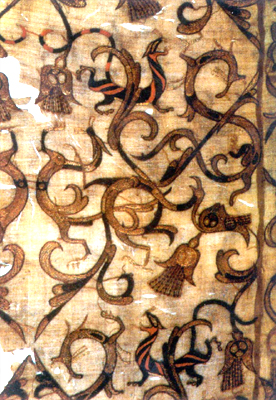 湖北江陵馬山楚墓出土。見于龍鳳虎紋繡羅單衣衣面;野咨_繡地。繡線可見紅棕、棕、黃綠、土黃、桔紅、黑、灰色。圖案由龍、鳳、虎三種動物組成。一側(cè)為鳳鳥,雙翅張開,有花冠,腳踏小龍。另一側(cè)是滿布紅黑(或灰)色條紋的斑斕猛虎,張牙舞爪朝前方奔逐大龍。大龍作抵御狀。圖案色彩鮮艷,繡工精細。